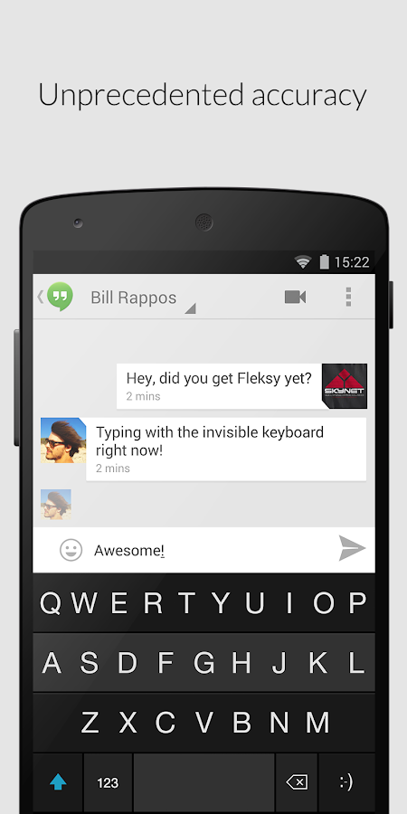 La potencia que hace posible a Fleksy es su tecnología exclusiva basada en la inteligencia geométrica. ¿No escribes con mucha precisión? ¿No eres muy diestro para tipear? ¡No hay problema! Fleksy sabrá qué palabra quisiste escribir aunque hayas presionado todas las letras incorrectas. Esta tecnología con patente pendiente no se limita a analizar las teclas que presionas. Se fija en DÓNDE tocaste y analiza tus patrones de tipeo para comprender la palabra que quisiste escribir.