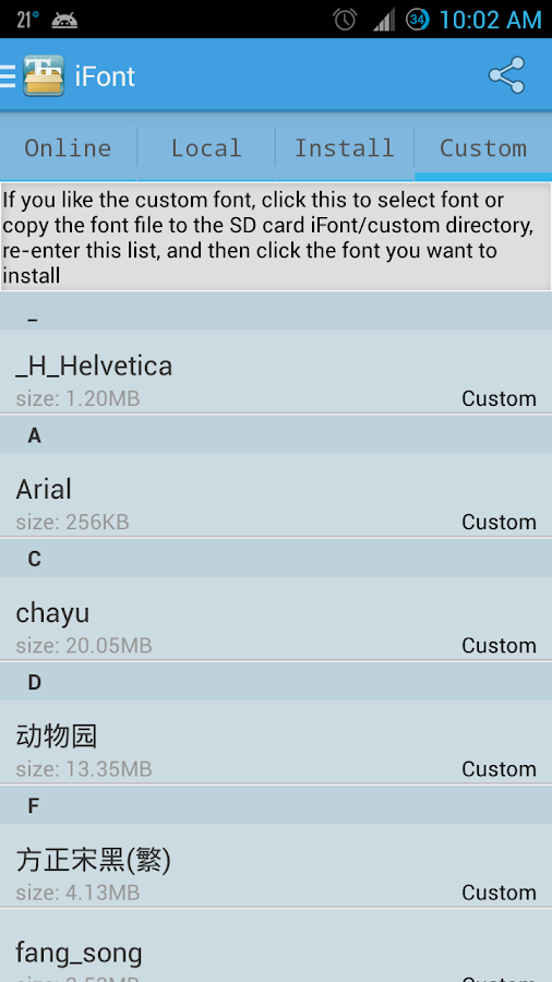 La aplicación está diseñada para instalar fuentes hermosas en su teléfono. Usted puede descargar y utilizar cientos de tipos de letra para hacer que su teléfono se convierta encantadora. Es fácil cambiar la fuente del sistema! Hermosas fuentes, hermoso estado de ánimo!