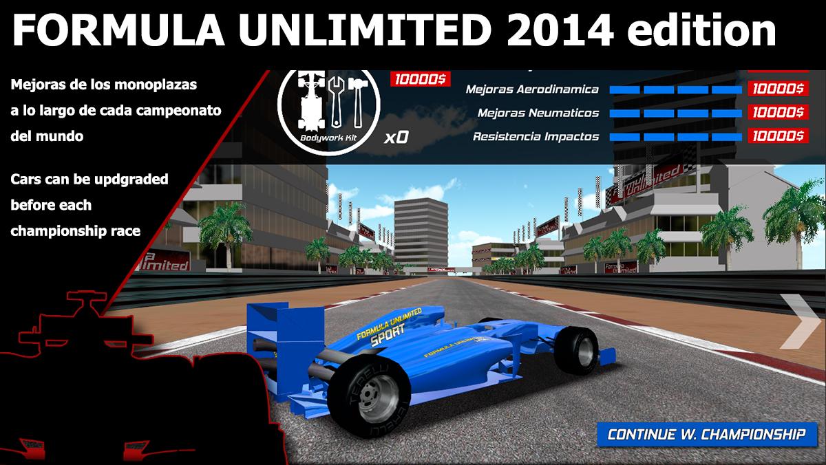Disfruta de esta nueva versión de Formula Unlimited. Un juego de competición de alto nivel, con monoplazas exclusivos y con un rendimiento muy superior a un Formula 1 o GP2 convencionales.