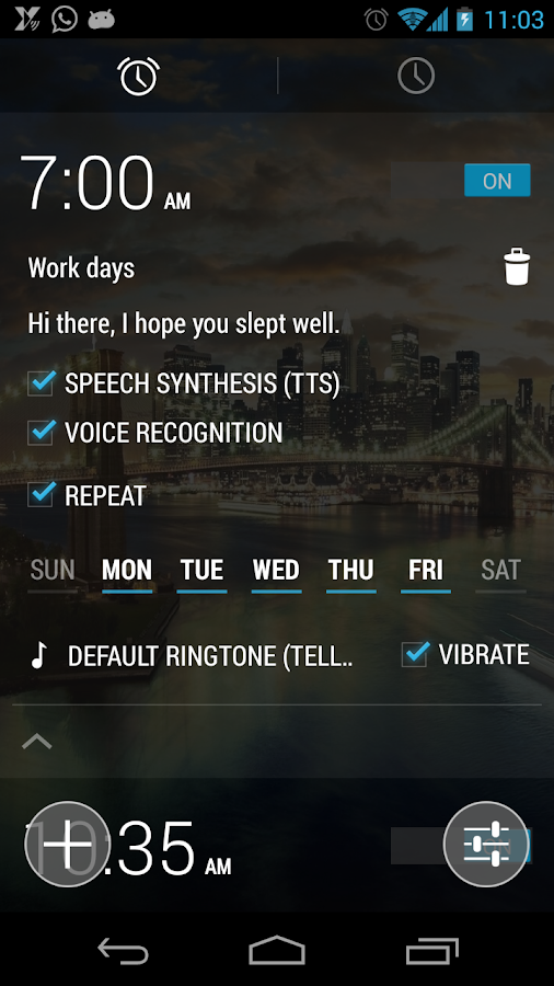 A través de la síntesis de voz, su aplicación hablará con usted. Le anunciará mensajes, el pronóstico del tiempo y las últimas noticias. Con el reconocimiento de voz, podrá parar la alarma desde su cama sólo con su voz.