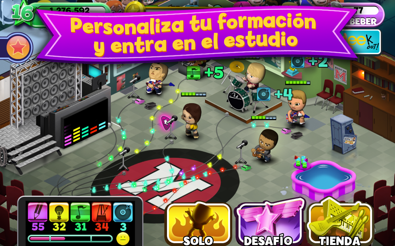 • Consigue montones de monedas y mejora tu equipo para dominar el mundo de la música