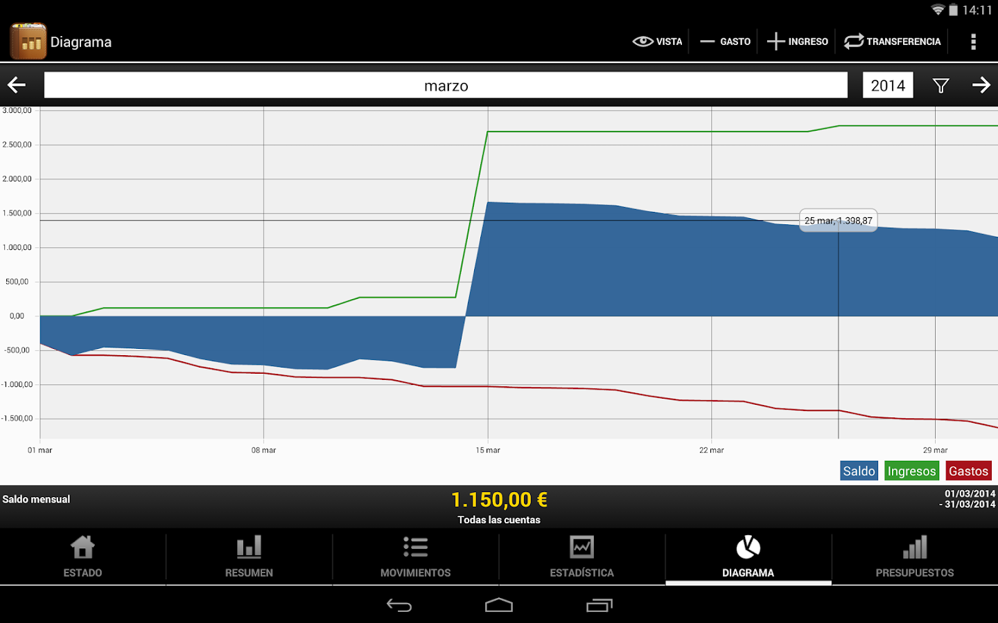 ✔ Consulte las estadísticas en forma de tabla o como gráfico para ver donde ha ido su dinero categorizando los ingresos y gastos.