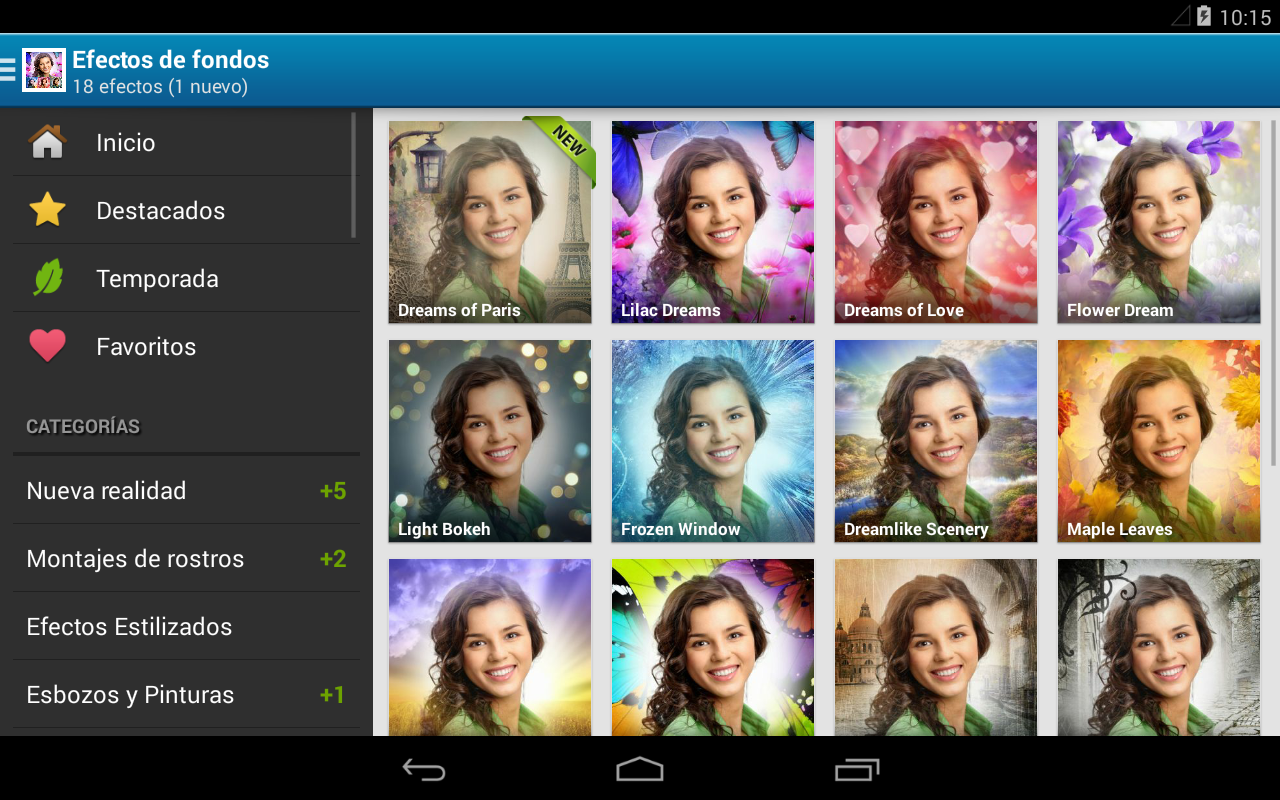 - efectos de plantilla para cambiar el fondo de tus fotos a paisajes fabulosos o alas de mariposa.