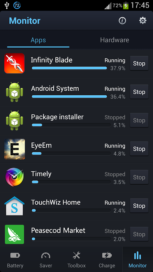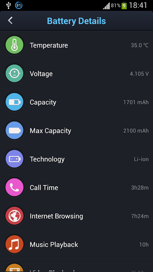 ✔ análisis más detallado del consumo de energía, no sólo aplicaciones, sino también los hardwares (CPU, pantalla, sensor, WiFi, radio), el monitor de la batería más profesional (notificador batería) hasta la fecha;