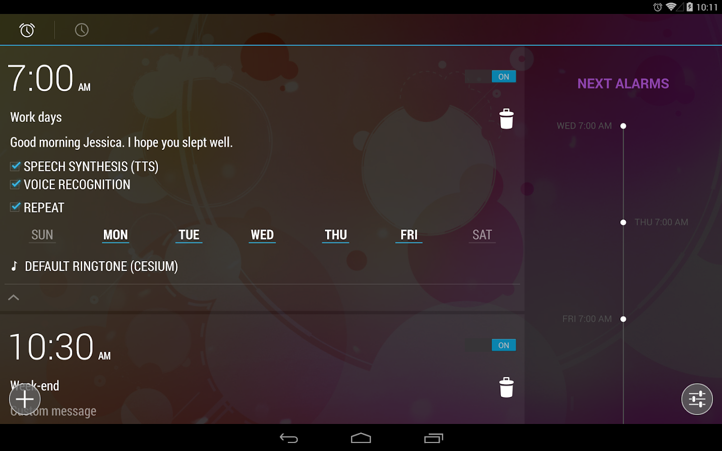 A través de la síntesis de voz, su aplicación hablará con usted. Le anunciará mensajes, el pronóstico del tiempo y las últimas noticias. Con el reconocimiento de voz, podrá parar la alarma desde su cama sólo con su voz.